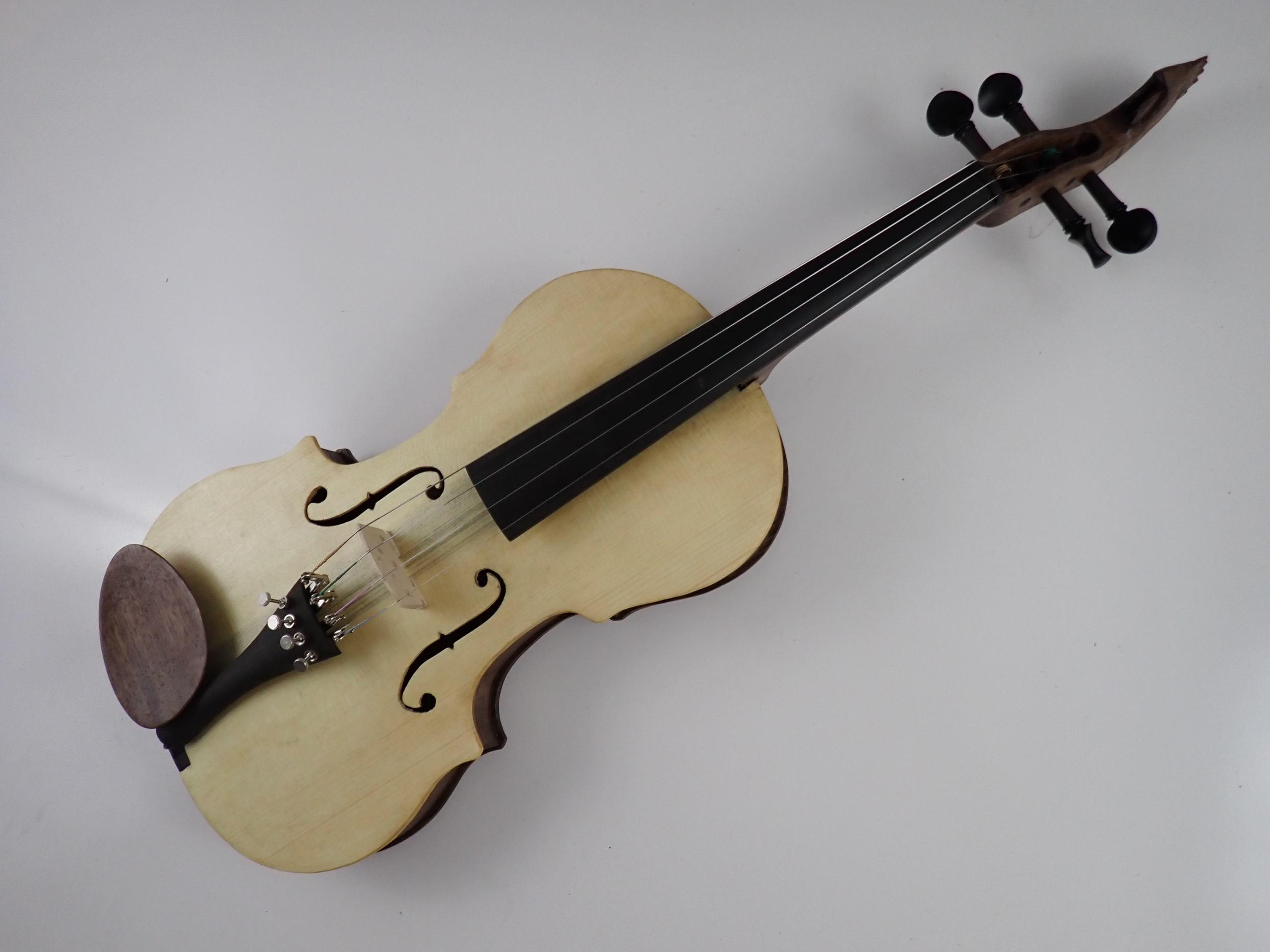 This fiddle is 4/4 size, as are all my fiddles so far. The back, ribs, neck, and chinrest are all walnut, and the soundboard is Engelmann spruce. The pegs, nut, fingerboard, tailpiece, endpin, and endrest are ebony. The pegs and endpin were bought, the rest were carved here. The finish is Tru Oil. If you want a case I can ship it in a new Featherweight for $40. To see a video of this fiddle please follow the link below.