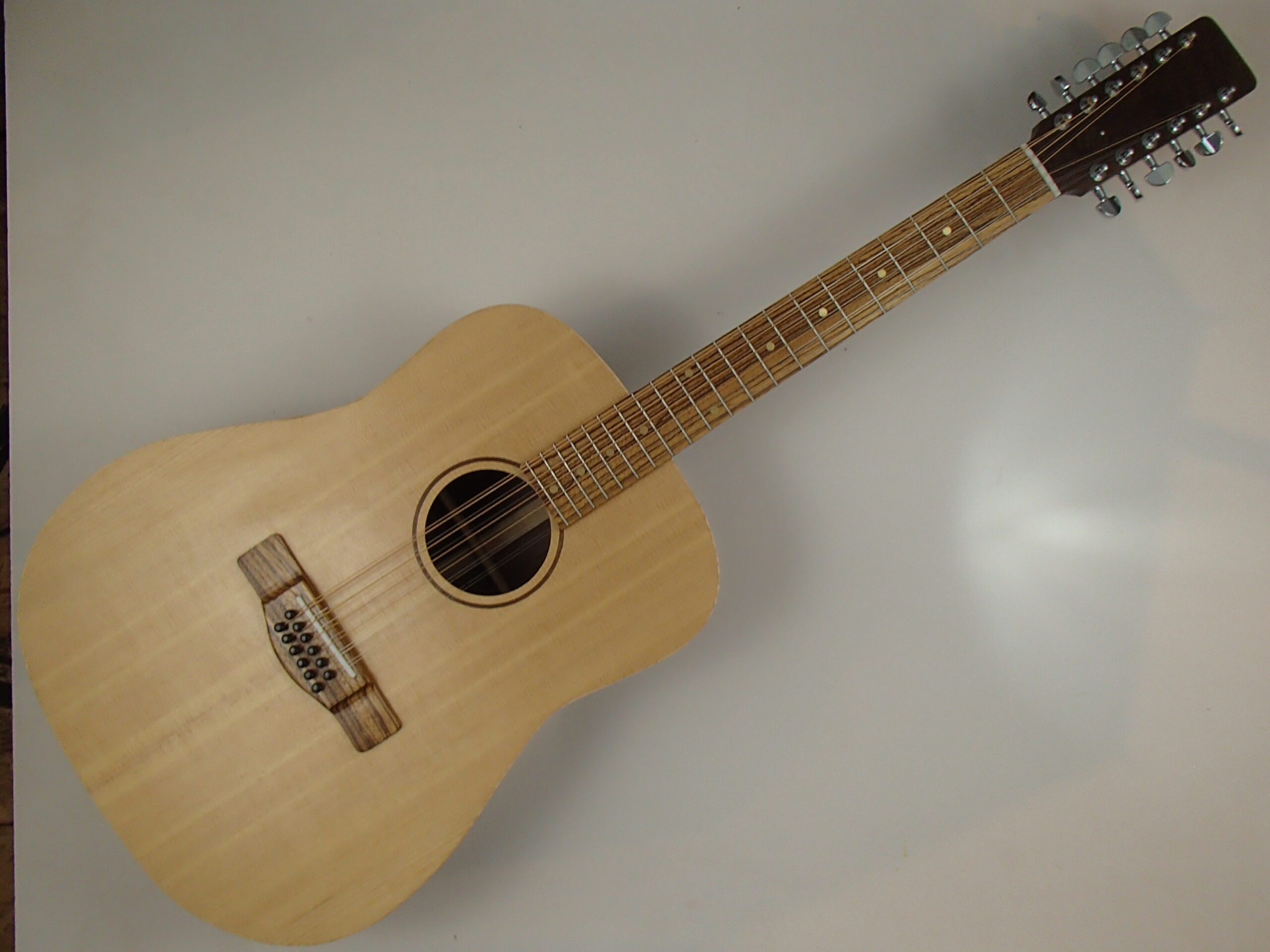 This is my first 12 string guitar. I’ve been wanting to make one for 10 years or so, so I finally did when I had some extra time in the shop. The back, sides, and neck are walnut, all from the same board. The soundboard is Sitka spruce from Alaska Tonewoods, the binding and neck stripe are curly maple, and the fretboard and bridge are zebrawood. The tuners are Gotoh, there is a two way truss rod in the neck, the bridge pins are ebony, and the nut and saddle are Corian. The scale length is 25.5″, the nut width is 1-7/8″, and the body depth is 4-3/4″ throughout. The finish is Tru Oil. To see a short but not-that-great video please follow the link below.