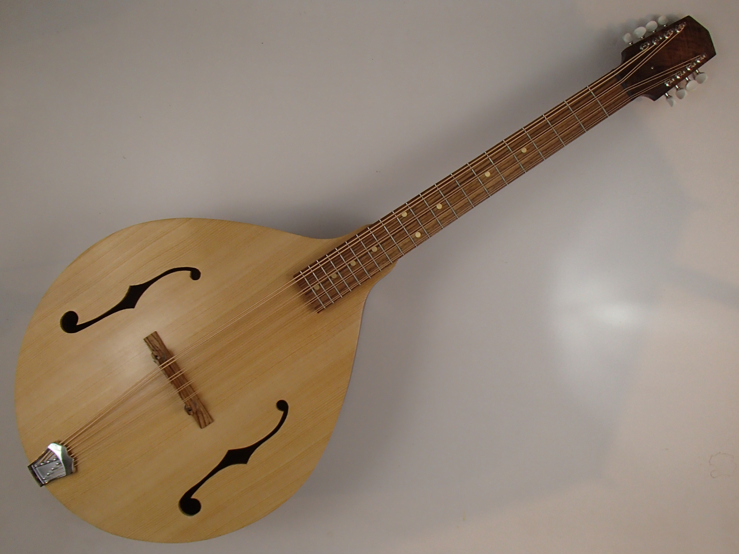 This mandocello is the first one I have built to have in stock. I built a custom one last fall, and thought it would be fun to make one to have on hand when I had time. It is based on a plan from Hovington Instruments in Canada, which is based on or drawn from a 1920s Gibson according to what I understand. The scale length is 25-3/8″ and the nut width is 1-3/4″. The back, sides, and neck are walnut, the top is Sitka spruce and the fretboard and bridge are zebrawood. There is a two way truss rod in the neck, the strings are D’Addario EJ80, and the tuners are Gotoh. This mandocello is discounted a bit because of a mistake I made which meant I had to put a patch on one side, up near the neck. There is a block throughout the area behind the repair, so it is not structural, but it is cosmetically regrettable. I have no mandocello skills, so this video is not what it could be, but it may give some idea of the sound.