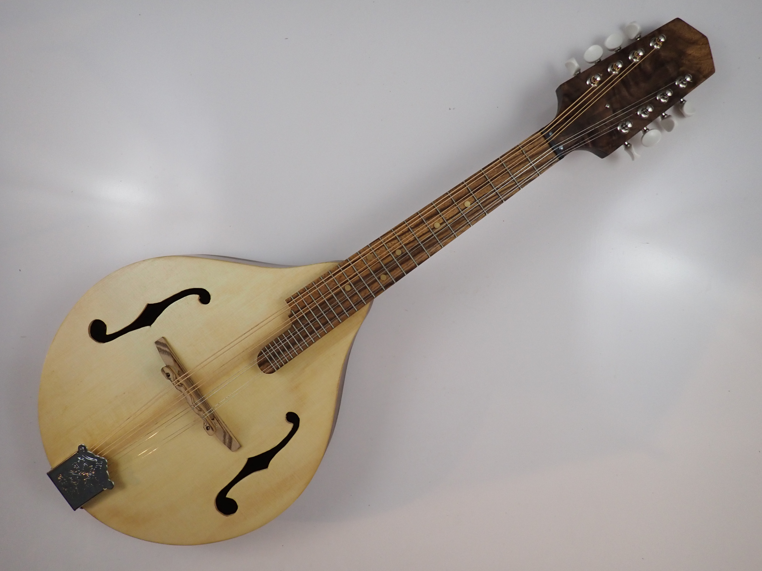 This mandolin was built in August 2023. It’s made from the same pattern as the others I’ve made, in the Ultimate Bluegrass Mandolin Construction Manual by Roger Siminoff. I made the F5 design in the book into an A5 by omitting the scrolls and points. The top and tone bars are Engelmann spruce, the fretboard and bridge are zebrawood, the peghead overlay is curly walnut and the neck, back and sides are walnut. This is my first mandolin from walnut and my first with a one piece back, though I have built fiddles like this for years. The nut is Corian, the dots are brass, the tailpiece is nickel plated and the tuners are Gotoh. There is a two way truss rod in the neck. The top and back are carved from solid wood in the customary way. My mandolin playing skills are soul-crushingly awful but I hope the video will give some idea of the sound the mandolin could produce in other hands.