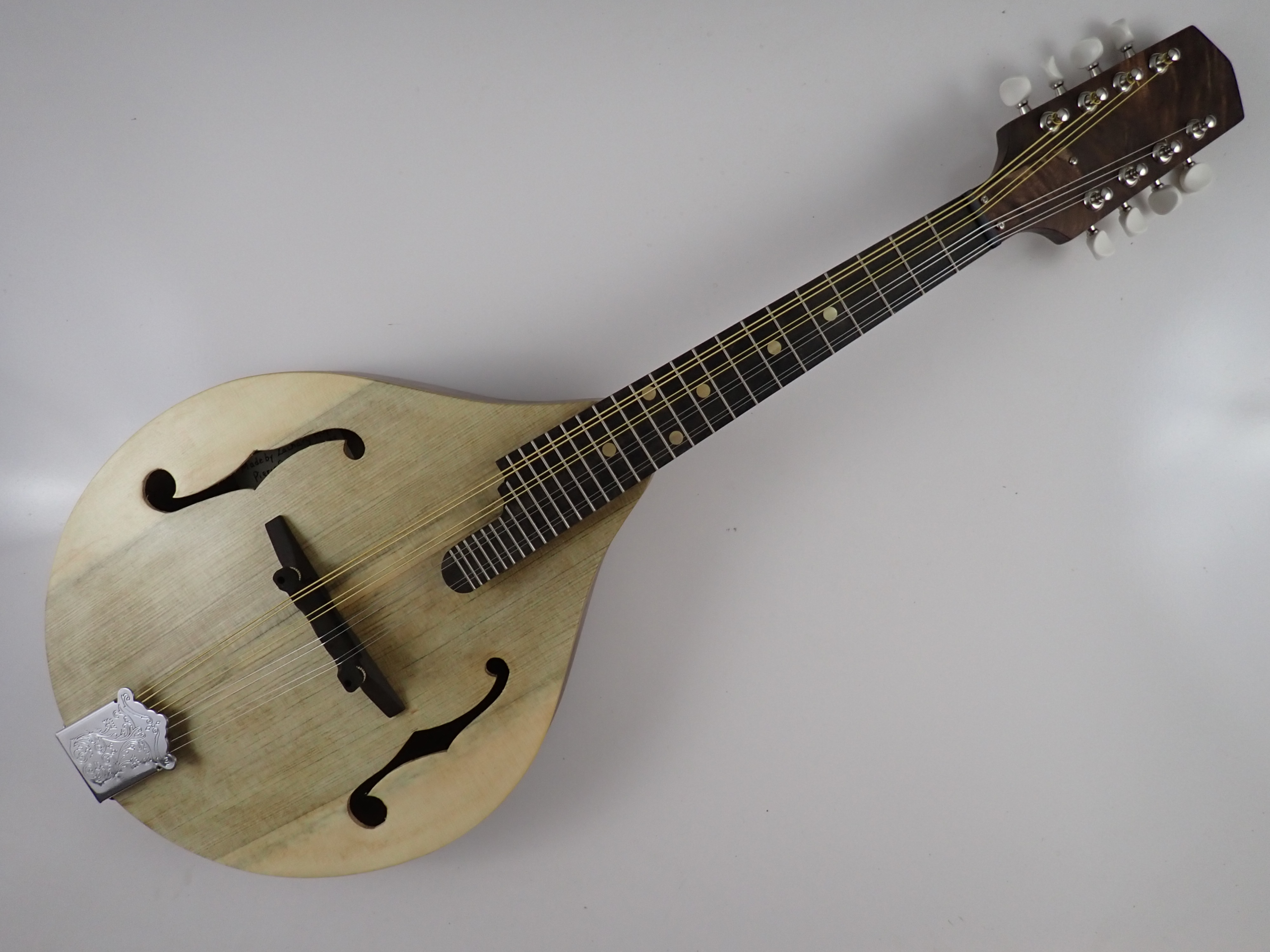 This mandolin was built in October 2023. It’s made from the same pattern as the others I’ve made, in the Ultimate Bluegrass Mandolin Construction Manual by Roger Siminoff. I made the F5 design in the book into an A5 by omitting the scrolls and points. The top and tone bars are Engelmann spruce, the fretboard and bridge are ebony, the peghead overlay is curly walnut and the neck, back and sides are walnut. The nut is Corian, the dots are brass, the tailpiece is nickel plated and the tuners are Gotoh. There is a two way truss rod in the neck. The top and back are carved from solid wood in the customary way. My mandolin playing skills are soul-crushingly awful but I hope the video will give some idea of the sound the mandolin could produce in other hands.