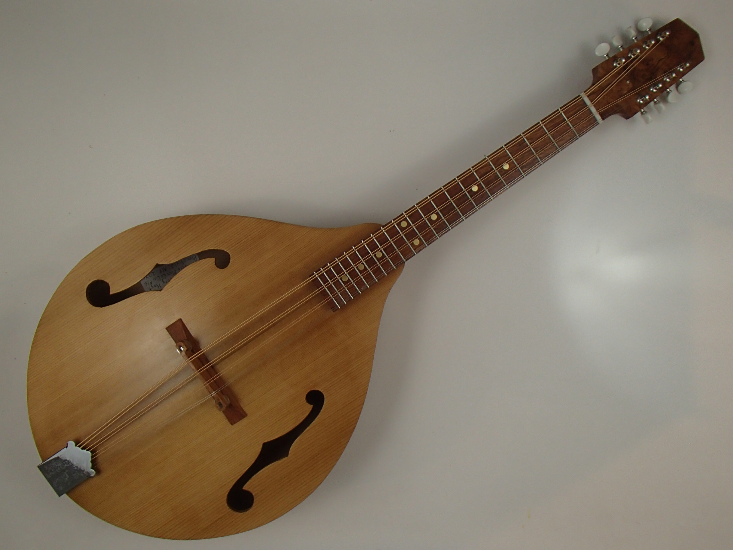 The fretboard has a 12″ radius, and there is a two way truss rod in the neck. The tuners are Gotoh, the strings are a John Pearse octave mandola set, the bridge adjustment wheels are from Stew-Mac, and the tailpiece is a generic import. The finish is Tru Oil, like I always use. To see a short video demonstration please follow the link below.