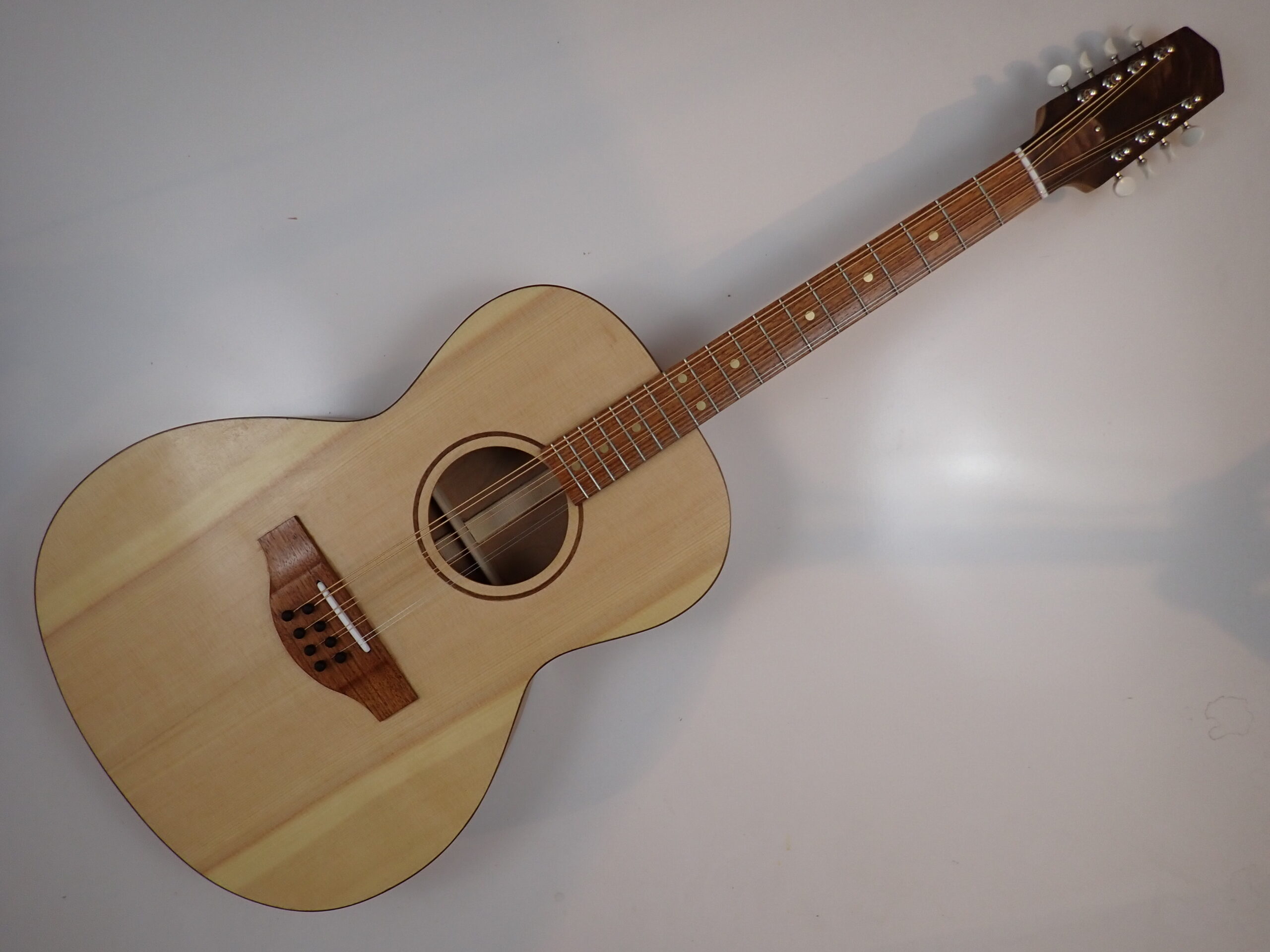 The neck is a soft V shape. The neck, sides, and back are cherry, the soundboard is Sitka spruce, the peghead overlay, neck stripe and binding are walnut, the bridge pins are ebony, and the fretboard and bridge are jatoba. The dots are brass, the nut and saddle are Corian, and the tuners are Gotohs. The finish is Tru Oil. I don’t have any mandolin playing skills but I hope the video will give some idea of the sound.