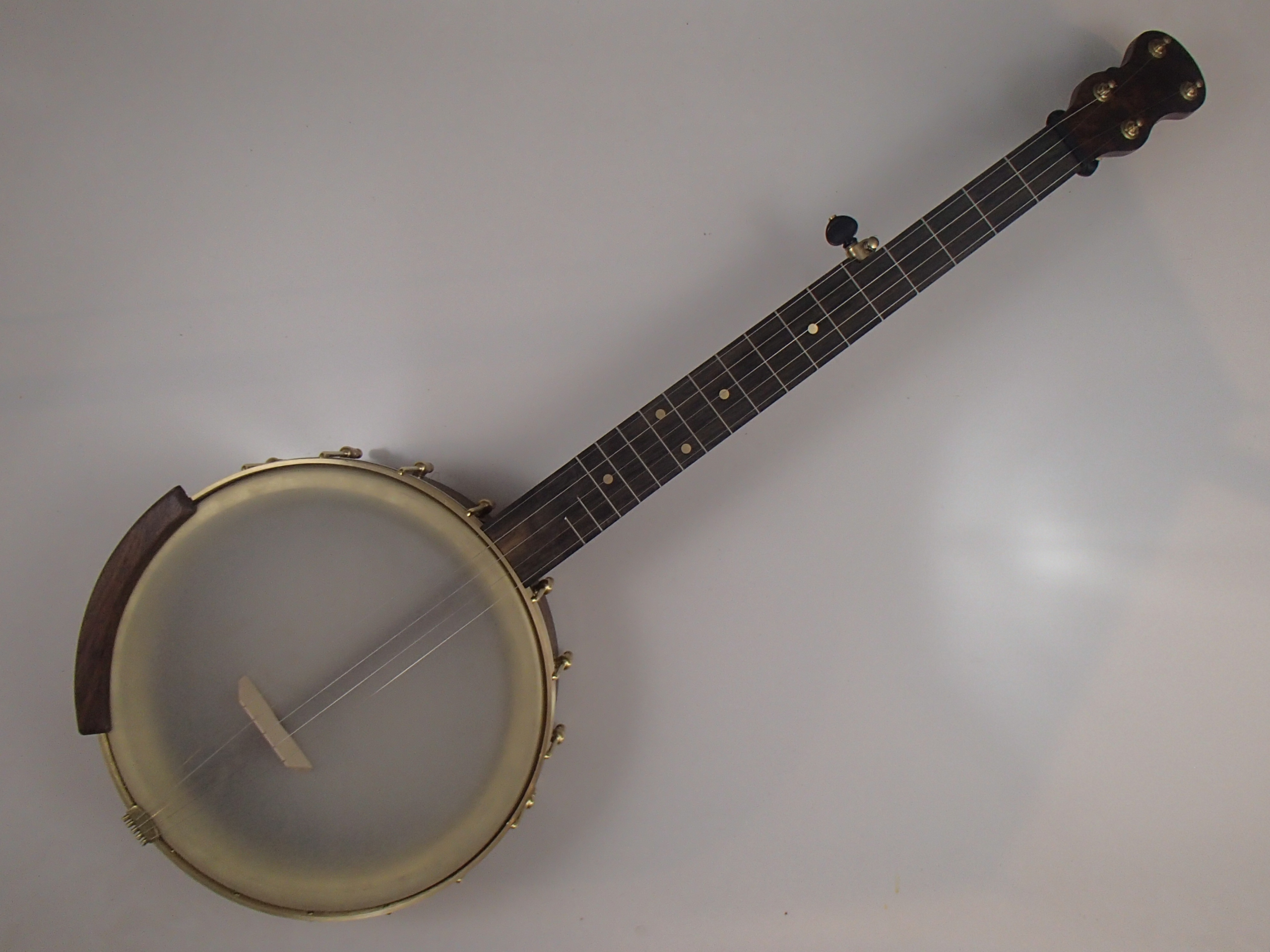 This banjo has a walnut rim, neck and Romero-style armrest, a slightly streaky ebony fretboard, and raw brass hardware. The wood has a Tru Oil finish. I will sell the banjo without the armrest for $35 less. The 12″ rim came from Nordic Shells and is 5/16″ thick, with a walnut rim cap. The rim is topped by a 1/4″ round brass tone hoop and a Dobson tone ring. The head is a Renaissance, and I can exchange it for a Fiberskyn at no charge. I made the Van Eps style tension hoop, the round tone hoop, and the dowel stick yoke. The head, tailpiece, strings, and Gotoh tuners came from Smakula Fretted Instruments and the Dobson tone ring came from Balsam Banjo Works. The hooks, nuts, and shoes came from Ode Banjos. The brass plate on the dowel stick has my name, the banjo number, and the town and year of production. There is a two way truss rod in the neck, accessed from the heel. The scale length is 25-1/2″, and the nut is 1-3/8″ wide and made from Corian. The 5th string nut is tall, to keep all the strings in the same plane, but I can shorten it so the 5th string rests on the 5th fret if you prefer. I can add 5th string spikes for $5 each. If you want a case I can send the banjo in a Superior CD-1536 or CD-2536 for $175. It is also fine to ship the banjo without a case if you don’t want one. To see a short video demonstration of this banjo please follow the link below: