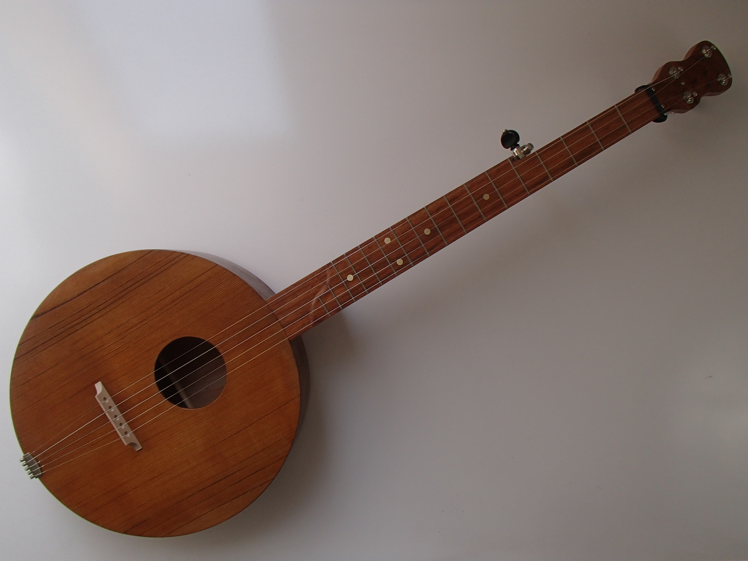This is an experimental wood topped banjo, or banjo hybrid of some kind. I was asked to make something similar about a year ago, and have been meaning ever since to make one to have in stock. This one is a bit different from the first one. The bridge is somewhat further from the tailpiece, in the area of the head where I like to put them on the regular banjos I build. Also it looks more like the banjos I normally make, without the fancier details (including the customer’s fine inlay work) from the first one. The sound seems to me almost or about as loud as my regular banjos, but with a bit more sustain. The weight is 3 pounds 3 ounces, and the banjo fits in an 11″ case since it doesn’t have all the hardware on the outside of the rim that a conventional banjo would.